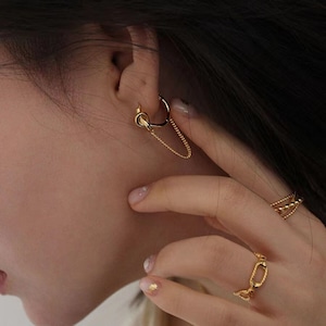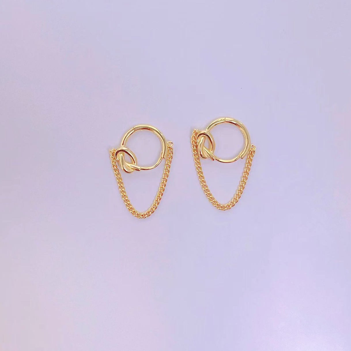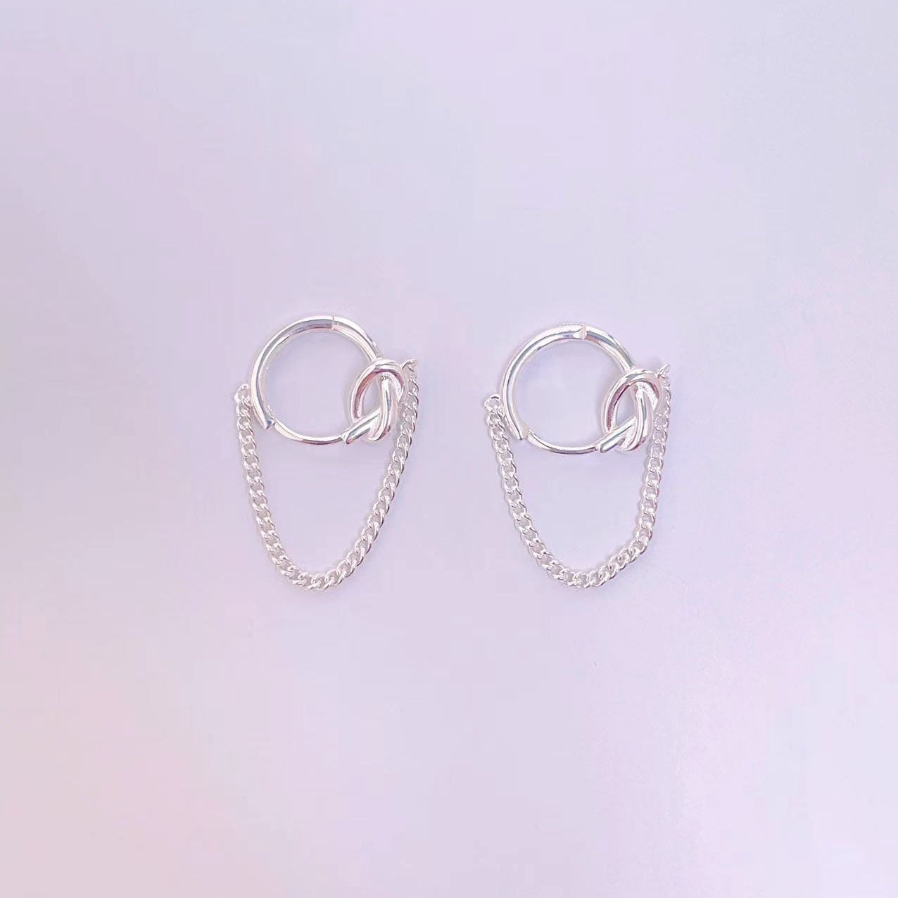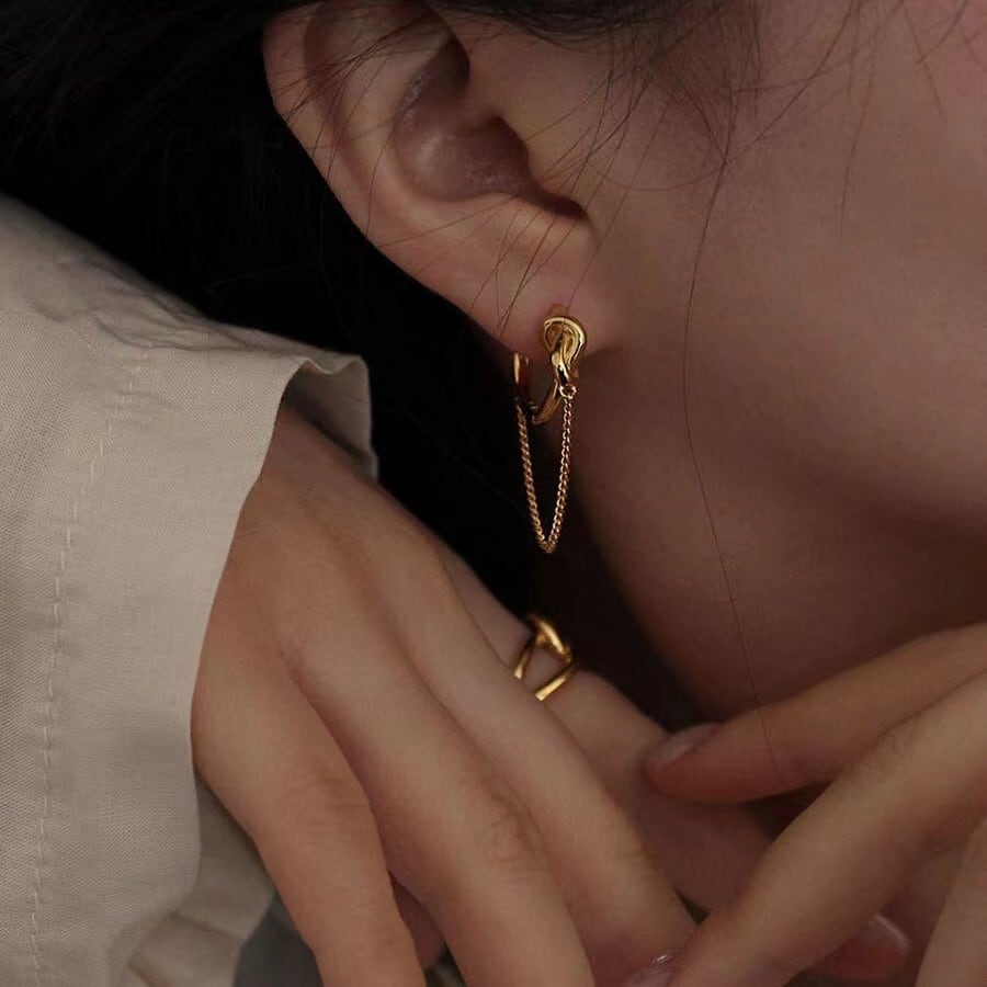 ユニークな結び目と垂れ下がるチェーンが組み合わさり、洗練されたスタイルを演出します。